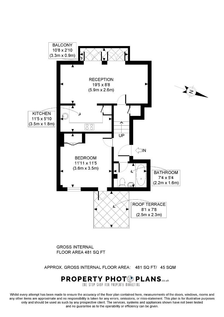 The property comprises an open plan reception kitchen (fully integrated) with a spacious front facing balcony, a modern bathroom suite and a generous bedroom complete with a roof terrace.