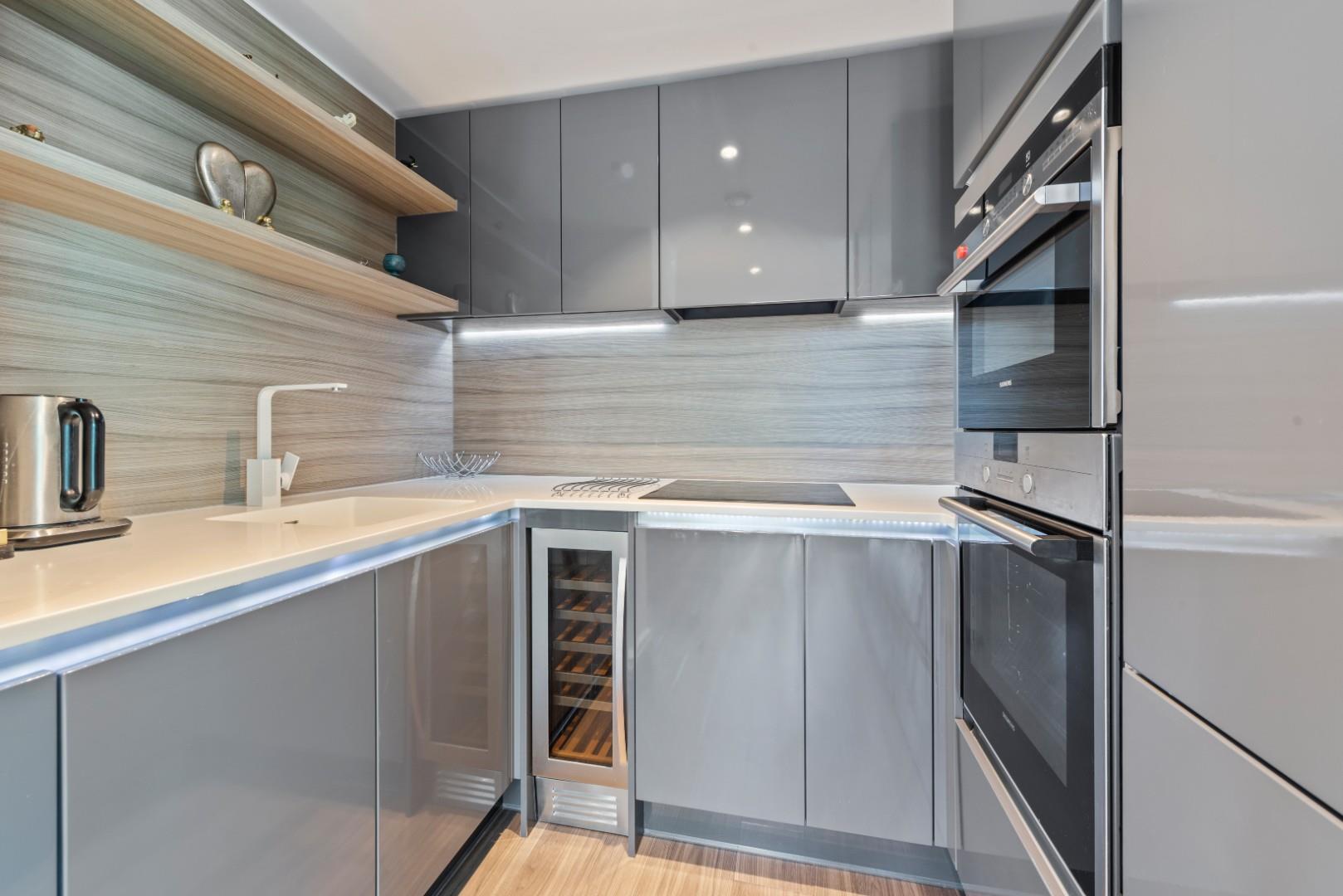 A charming entrance hall leads to the bedroom and living spaces. The open-plan kitchen offers integrated Siemens appliances, including a dishwasher and wine fridge. The bright, living and dining area opens onto the balcony for al-fresco dining and working outside in the summer.