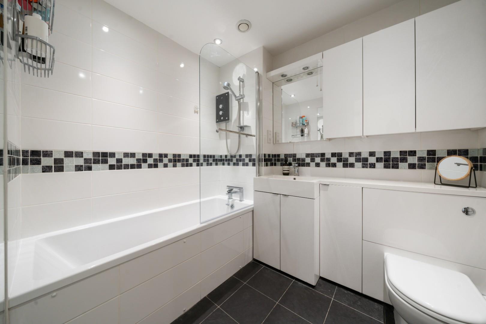 Both bedrooms are double, with one bedroom having an en-suite shower room. The main bathroom features contemporary tiles and additional cupboard space.