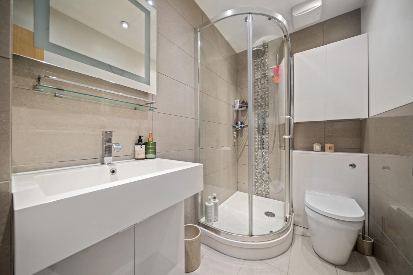 - Modern bathroom with corner shower