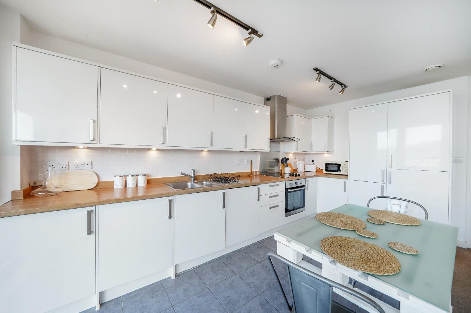 Inside, you’ll find one open plan reception/fully integrated kitchen, which leads to the first oversized west facing balcony, this floor has a useful understairs storage cupboard and an extra W.C.
