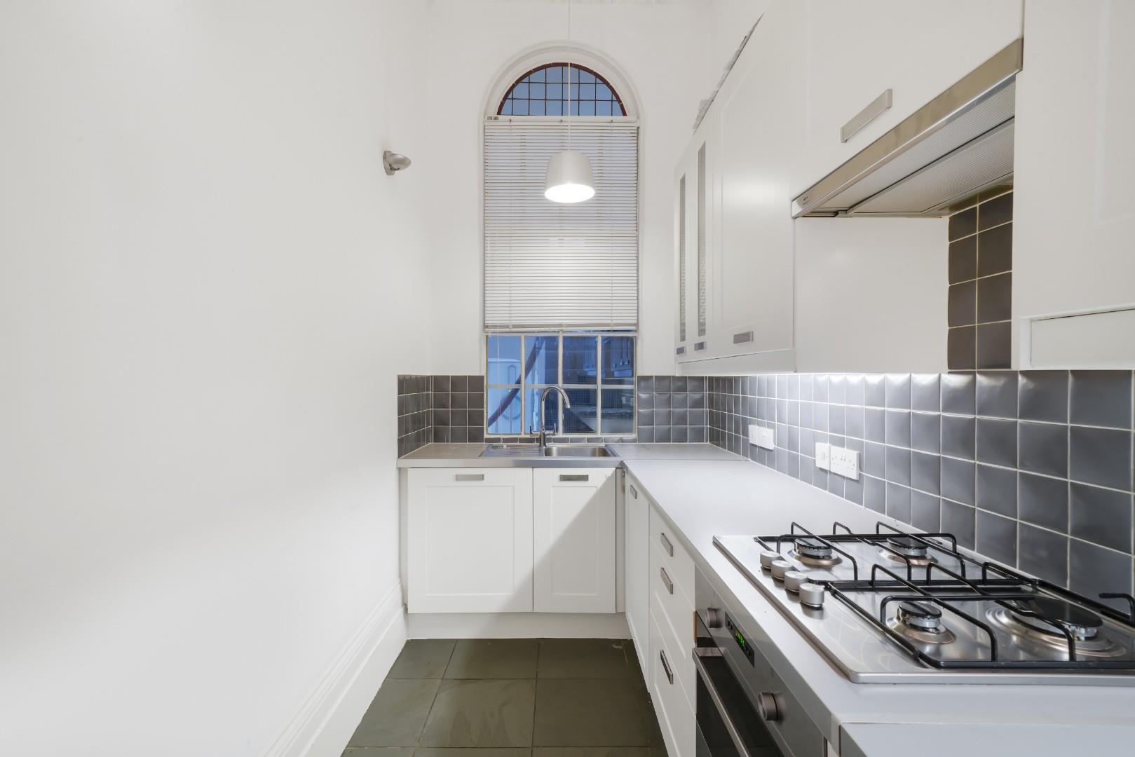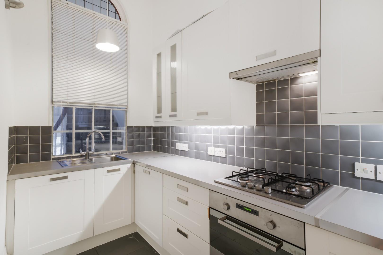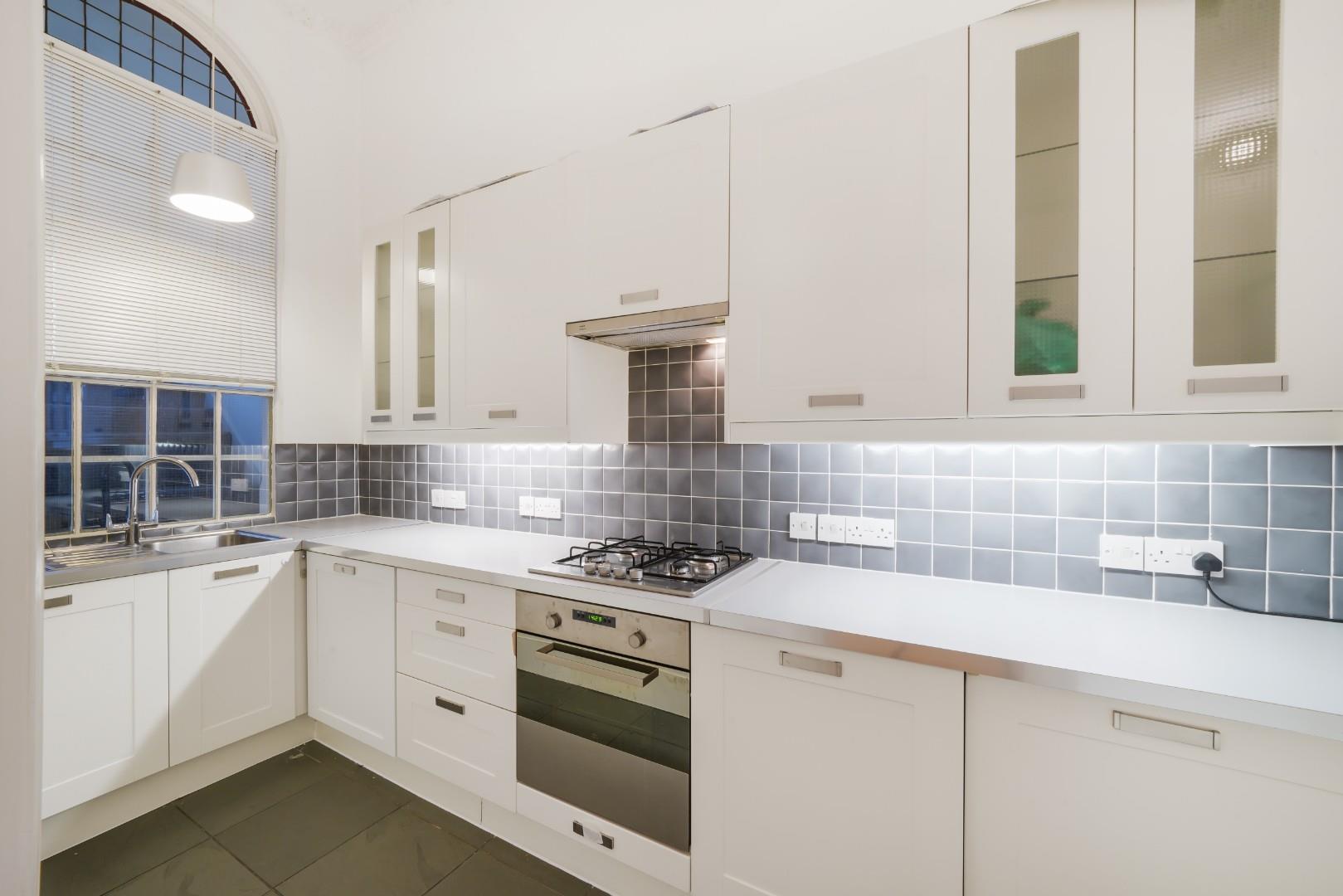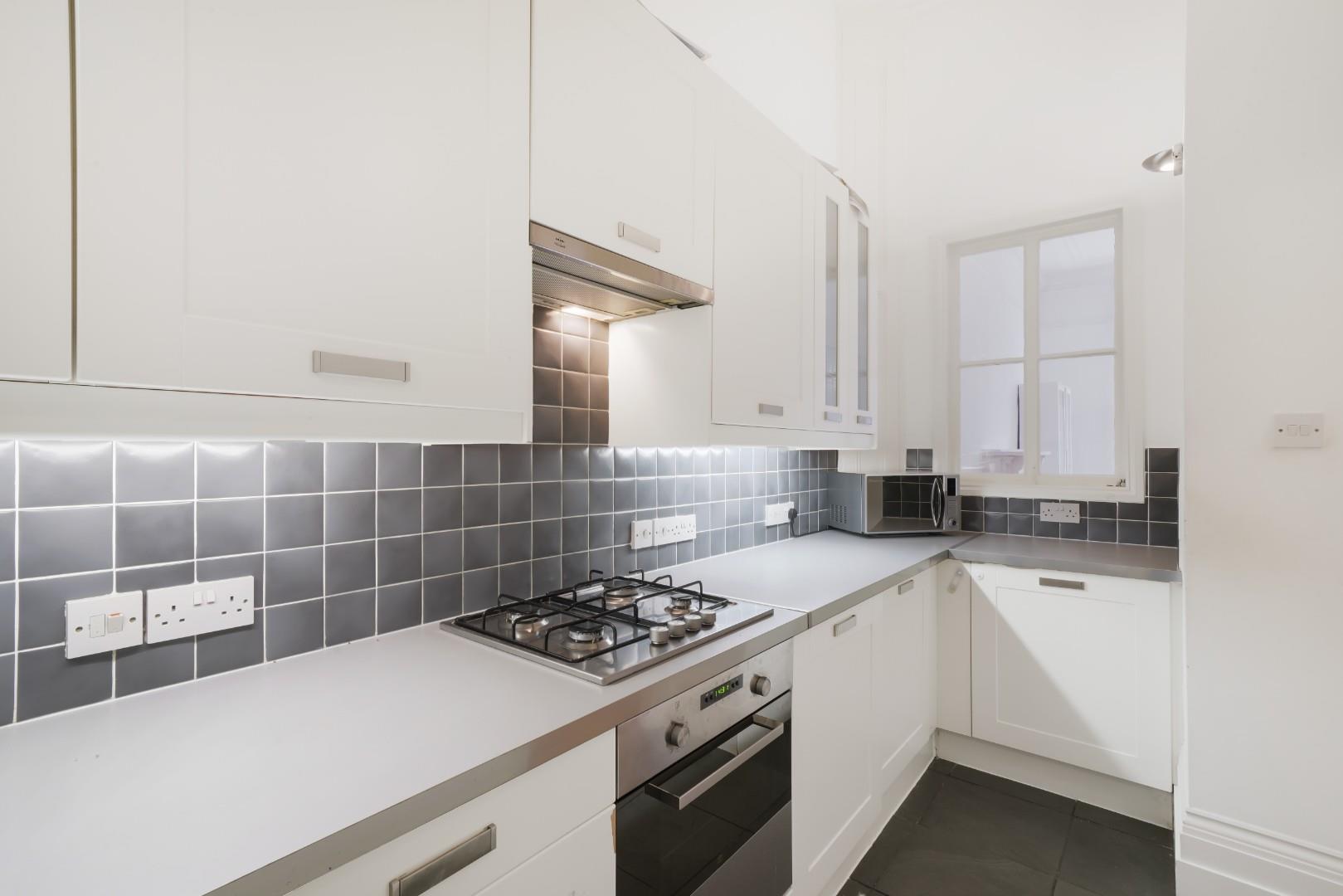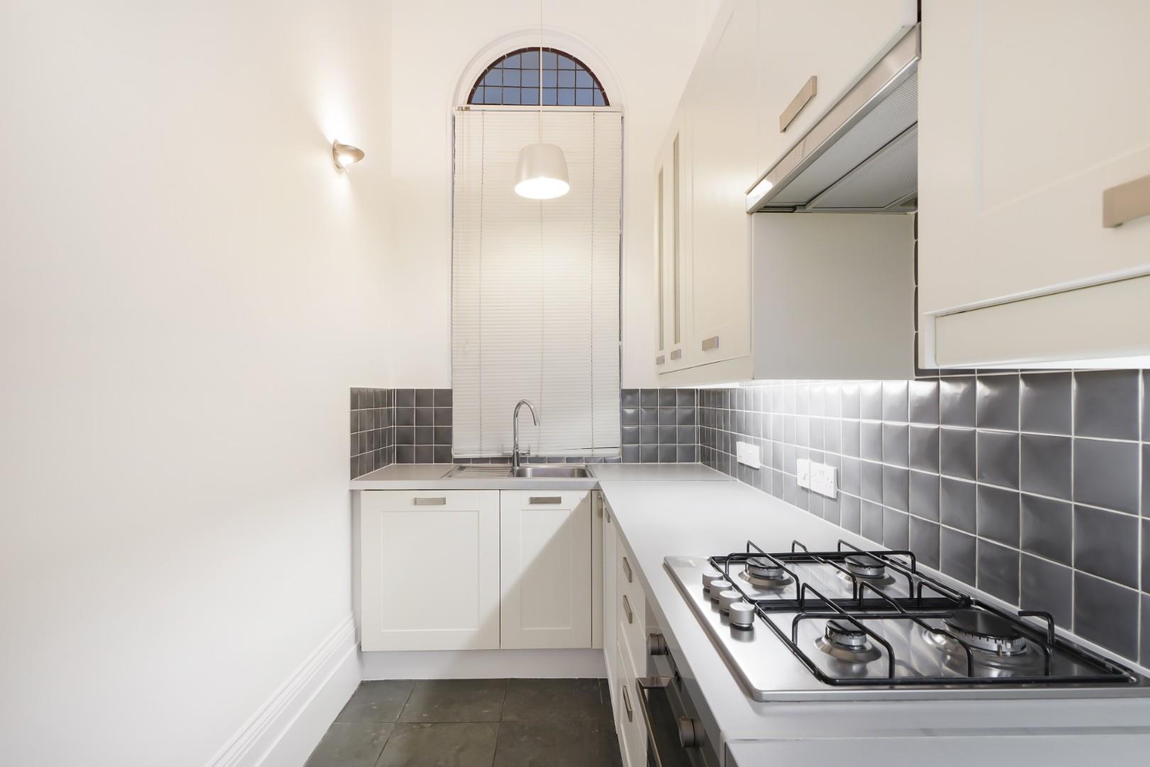 The separate kitchen is modern and offers partially integrated appliances, located off the hallway.
