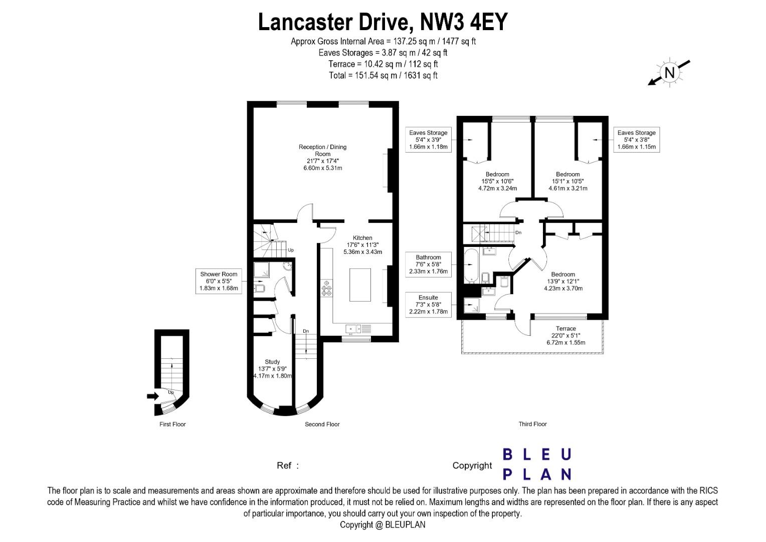 The property offers three large bedrooms, a separate study, and three bathrooms, including an en suite to the main bedroom. A large eat-in kitchen sits separately from the main living space, with the added benefit of a private roof terrace.