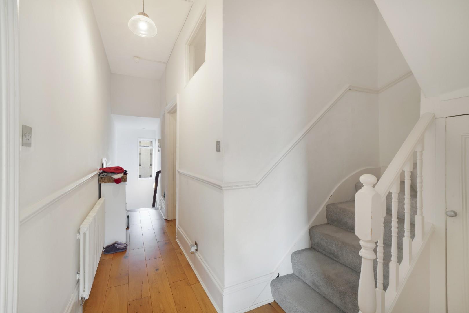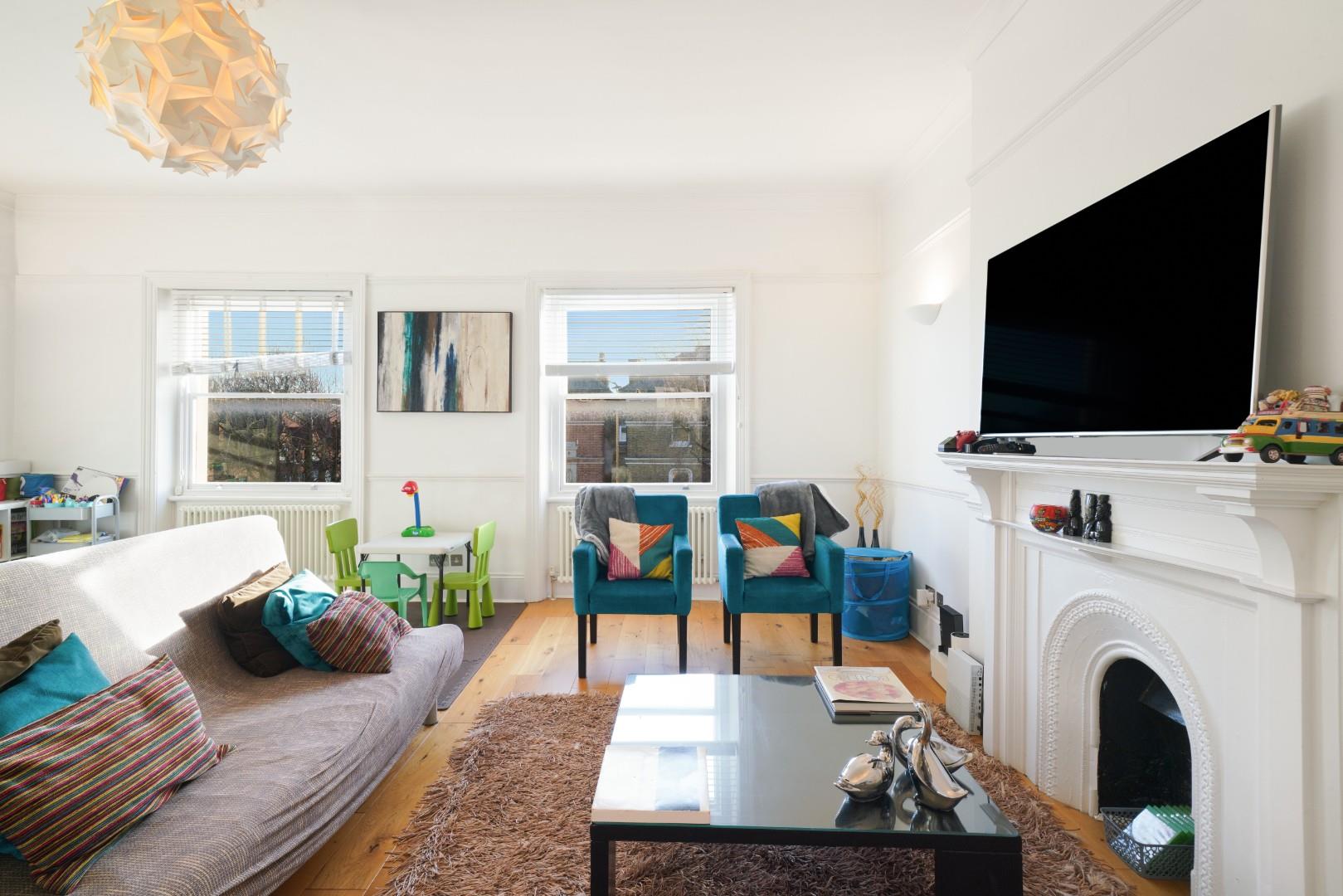 This spacious apartment occupies the top two floors of this stunning period home with stucco ornamentation, accessed via a well-maintained communal entrance.