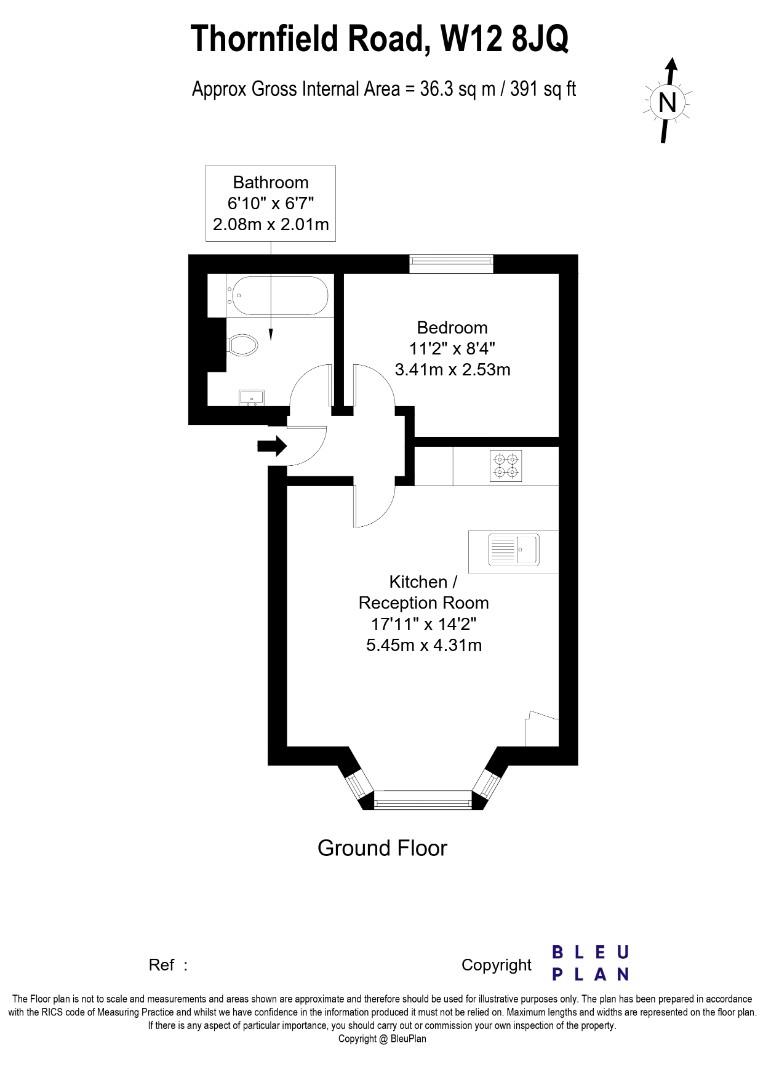 The property comprises an open plan reception reception/kitchen, with a feature bay window which overlooks the front entrance (South facing), the bedroom is to the back of the building and sits next to the bathroom (shower and bathtub).