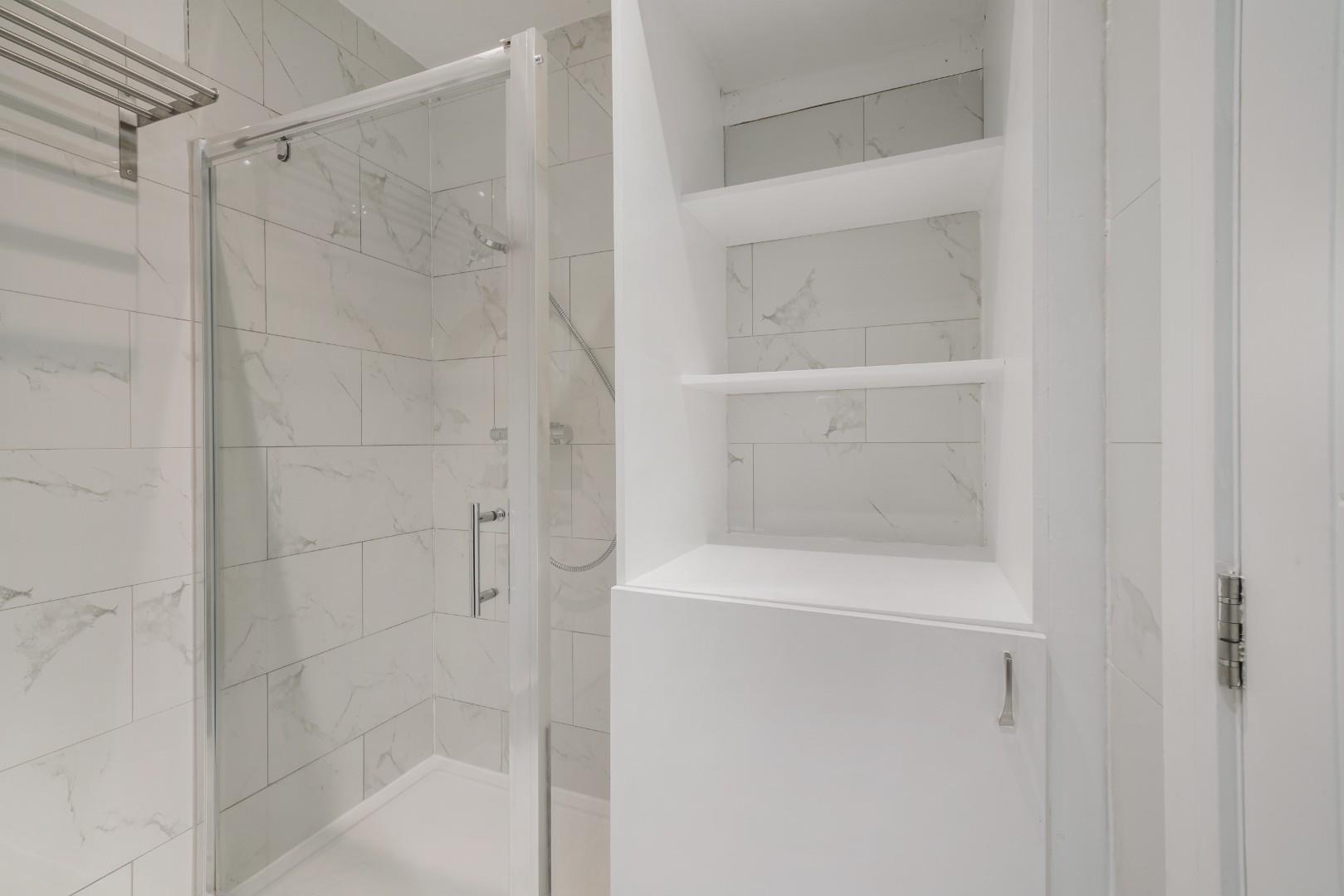 A large modern shower suite completes the home.